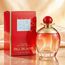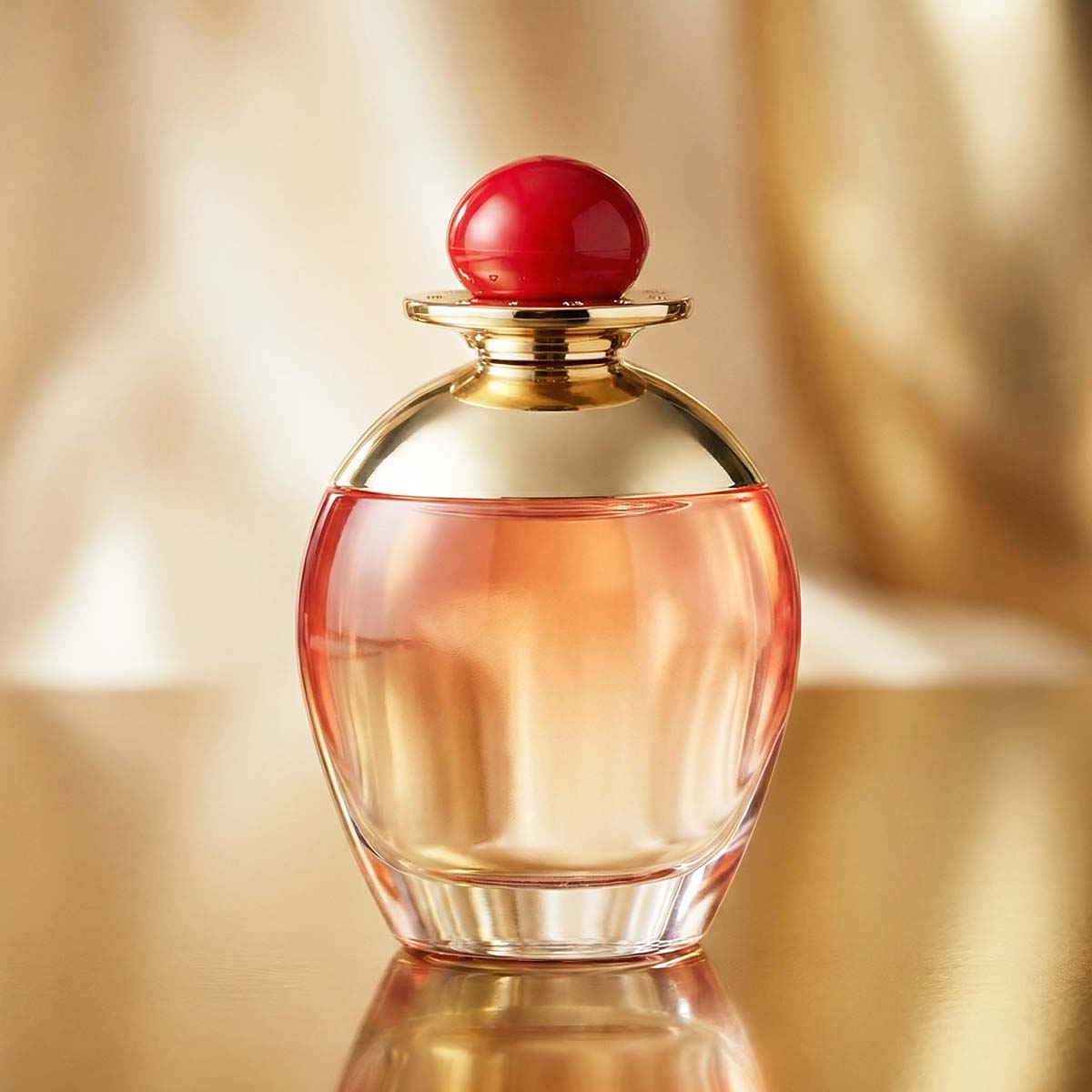 زجاجة أنيقة بتدرج أحمر شفاف وغطاء ذهبي مع كرة حمراء، تعكس الطابع الكلاسيكي والجاذبية الهادئة للعطر
