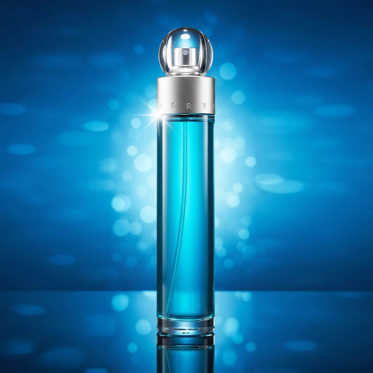 زجاجة أسطوانية شفافة بلون تركوازي جذاب، مع غطاء فضي معدني وكرة زجاجية علوية، وتغليف أنيق بنفس اللون يعكس طابع العطر العصري.