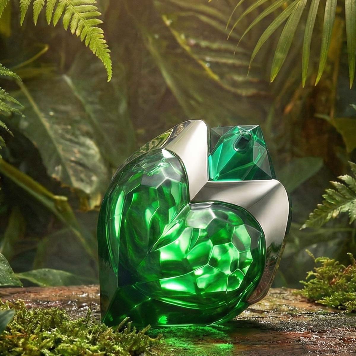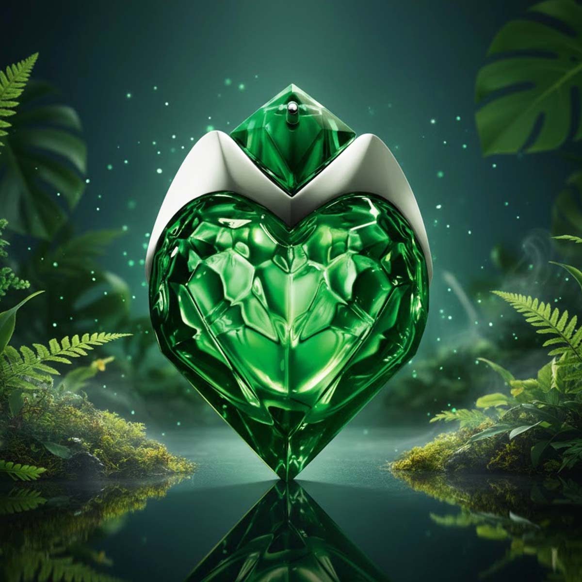 زجاجة على شكل قلب زمردي مصقول، تعكس القوة الداخلية والجاذبية الطبيعية، مع عبوة قابلة لإعادة التعبئة
