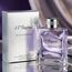 زجاجة شفافة أنيقة تحتوي على سائل بلون لافندر ناعم، مع غطاء فضي أنيق وتغليف فضي راقٍ يحمل توقيع S.T. Dupont.
