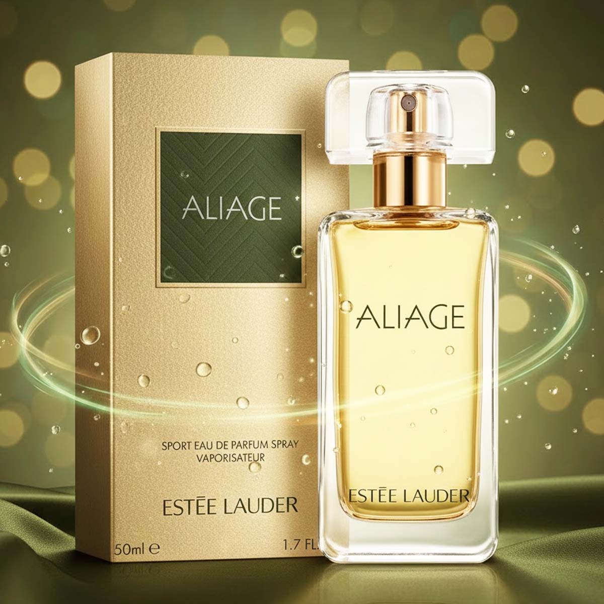 زجاجة شفافة أنيقة بسائل أصفر فاتح وغطاء بخاخ ذهبي، مع تغليف ذهبي يحمل شعار Aliage داخل مربع أخضر بأسلوب رياضي راقٍ.