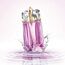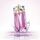 زجاجة وردية متلألئة بتصميم كريستالي فني، تعكس روح العطر المنعشة، مع تغليف أبيض مزين بلمسات وردية أنيقة.