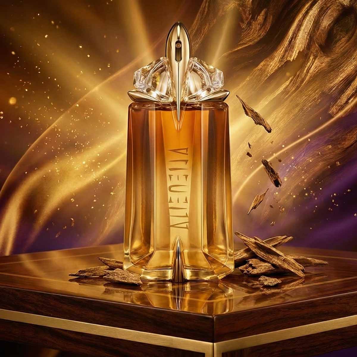 زجاجة ذهبية بتصميم كريستالي فني يشبه الأحجار الكريمة، تعكس طابع العطر الأسطوري والمهيب، مع تغليف فاخر يحمل توقيع Mugler.