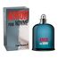 زجاجة شفافة بلون أزرق داكن مع غطاء فضي معدني، وتغليف أنيق يجمع بين الرمادي الداكن والأحمر الجريء – يعكس روح العطر الشبابية والجذابة.