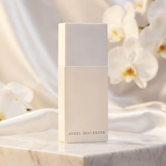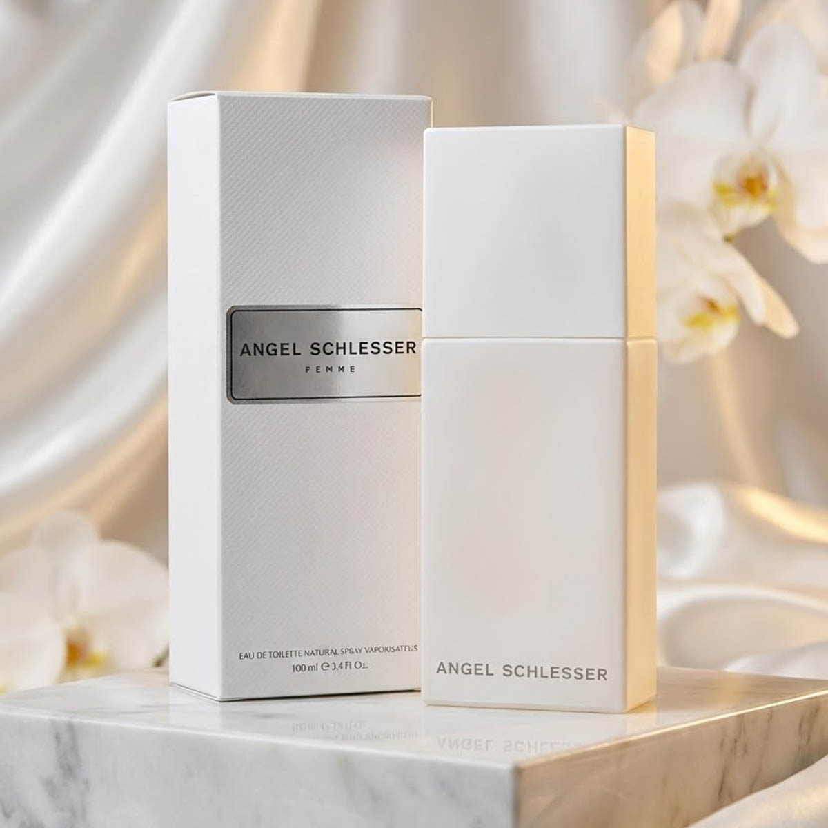 زجاجة بيضاء مستطيلة بتصميم بسيط وأنيق، مع تغليف أبيض يحمل توقيع Angel Schlesser بأسلوب عصري راقٍ.