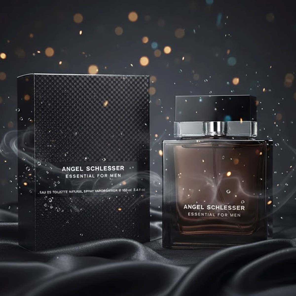 زجاجة بيضاء مستطيلة بتصميم بسيط وأنيق، مع تغليف أبيض يحمل توقيع Angel Schlesser بأسلوب عصري راقٍ.