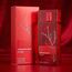 زجاجة حمراء أنيقة بتصميم مستطيل عصري، مزينة بنقشة أغصان أنثوية، مع تغليف متناغم يحمل شعار In Red بأسلوب بسيط وجريء.