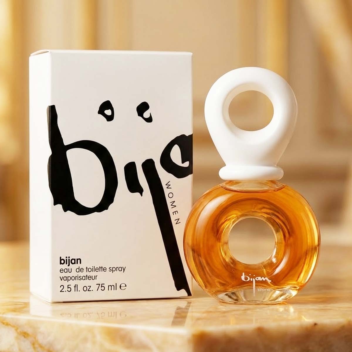زجاجة دائرية فريدة بسائل كهرماني وغطاء أبيض بتصميم حلقي مميز، مع تغليف أبيض يحمل شعار Bijan بأسلوب فني جريء.