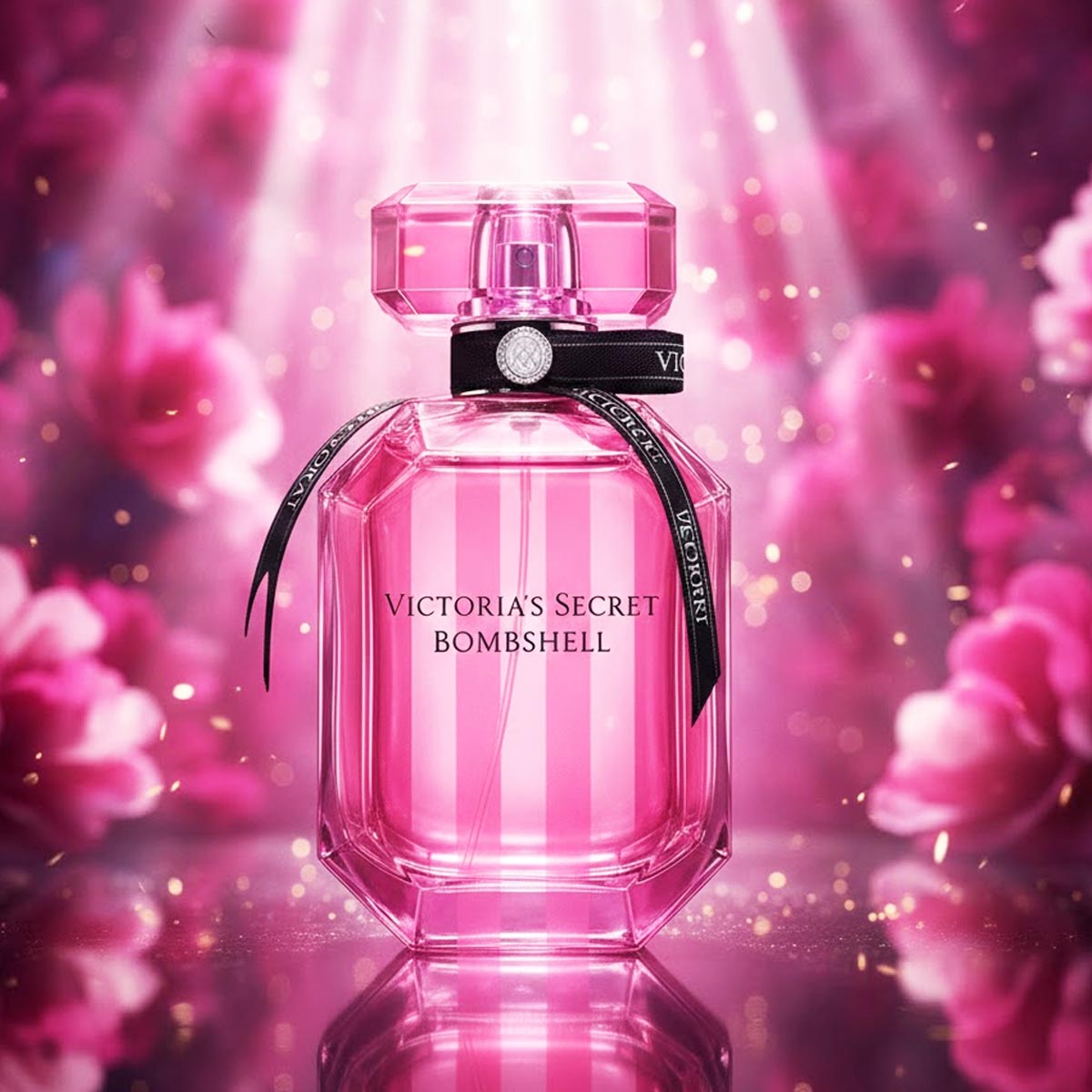 زجاجة وردية متعددة الأوجه بغطاء أنيق وشريط أسود يحمل توقيع Victoria’s Secret، داخل تغليف وردي بخطوط عمودية يعكس روح العطر الحيوية والجذابة.