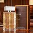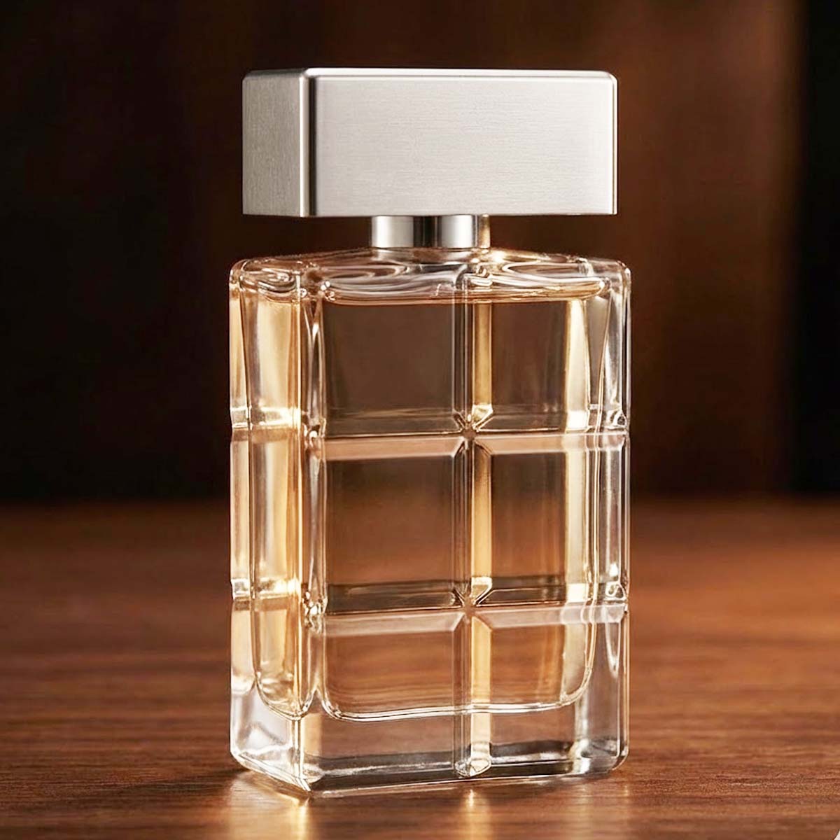 A transparent bottle with a grid-like texture and metallic rectangular cap, housed in a brown box with orange accents that reflect the fragrance’s modern and masculine character.