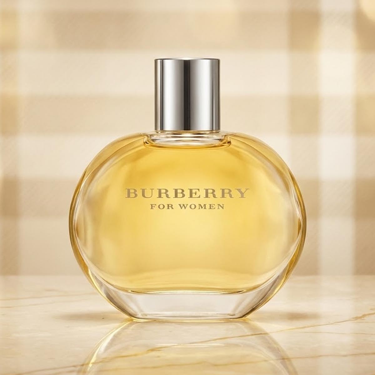 زجاجة دائرية أنيقة بسائل ذهبي وغطاء فضي، مع تغليف يحمل نقشة Burberry الكلاسيكية بلون بيج راقٍ.