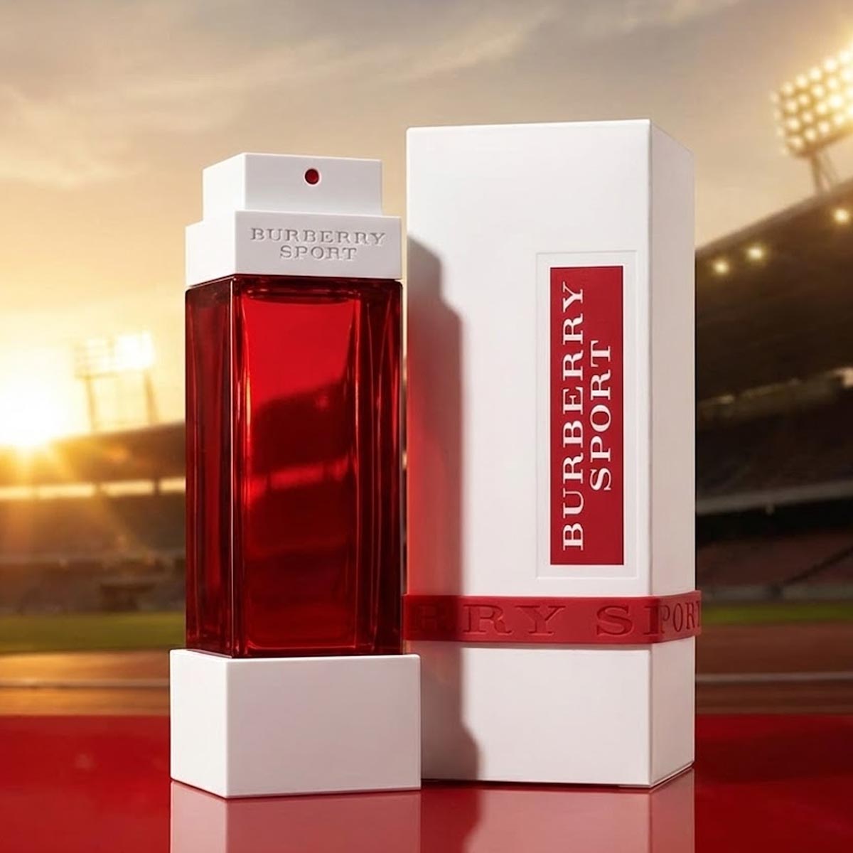زجاجة بيضاء أنيقة بتفاصيل حمراء جريئة، مع تغليف عصري يعكس الطابع الرياضي والهوية البريطانية المميزة.
