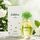 زجاجة بيضاوية أنيقة تحتوي على سائل ذهبي، مع غطاء أخضر بتصميم يشبه باقة زهور، وتغليف أبيض مزين بزخارف زهرية يعكس روح العطر الحالمة والطبيعية.