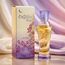 زجاجة أنيقة بتدرج بنفسجي شفاف مع غطاء بنفسجي لامع، وتغليف فاخر بتدرج أبيض إلى بنفسجي مزين بزخارف زهرية يعكس روح العطر الحالمة والأنثوية.