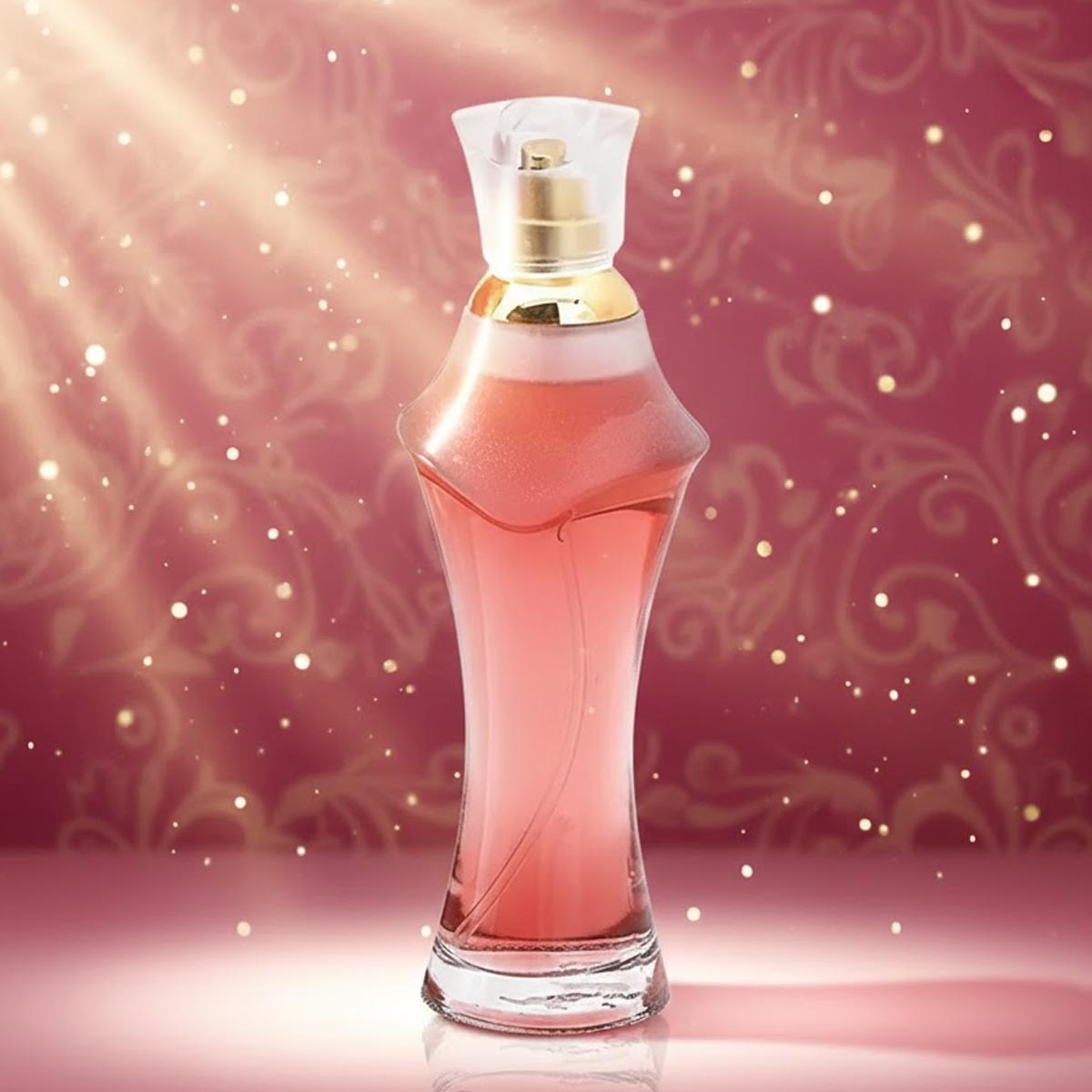 زجاجة منحنية أنثوية بتدرج وردي أنيق، مع غطاء شفاف وشريط فضي، وتغليف معدني وردي يحمل اسم العطر بخط ذهبي فاخر.