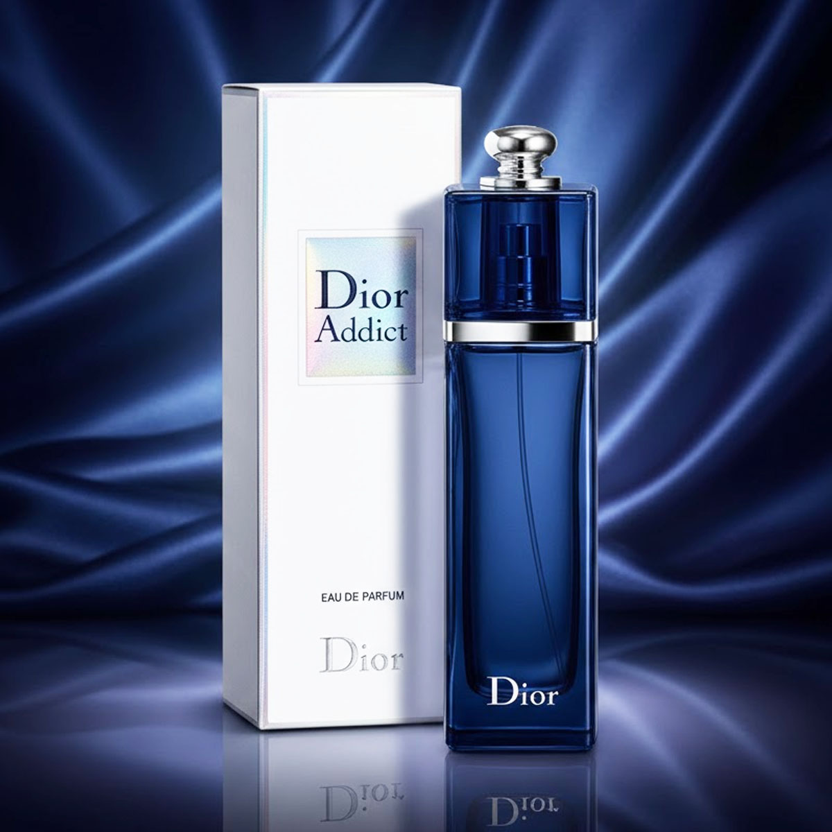 زجاجة أنيقة بلون أزرق داكن بتصميم مستطيل فاخر، مع غطاء فضي لامع، وتغليف أبيض يحمل شعار Dior Addict بلمسة هولوغرافية جذابة.