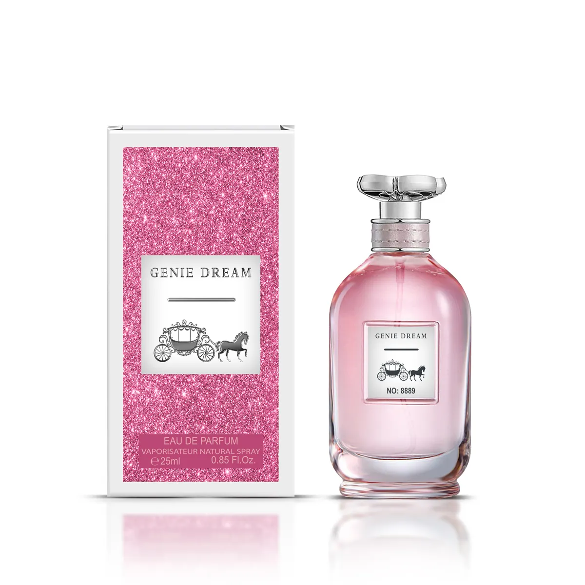 عيشي تفاصيل قصتك الخيالية مع عطر جيني دريم (Genie Dream) رقم 8889. يجسد هذا العطر روح التفاؤل والأحلام الوردية، حيث يأتي في زجاجة شفافة تكشف عن سائل وردي ناعم، يتوجها غطاء فضي مبتكر على شكل "زهرة" (Flower Turnlock)، ويزينها شعار "العربة الملكية" (Horse-drawn Carriage) الذي يعيدك إلى سحر القصص الكلاسيكية والأميرات.