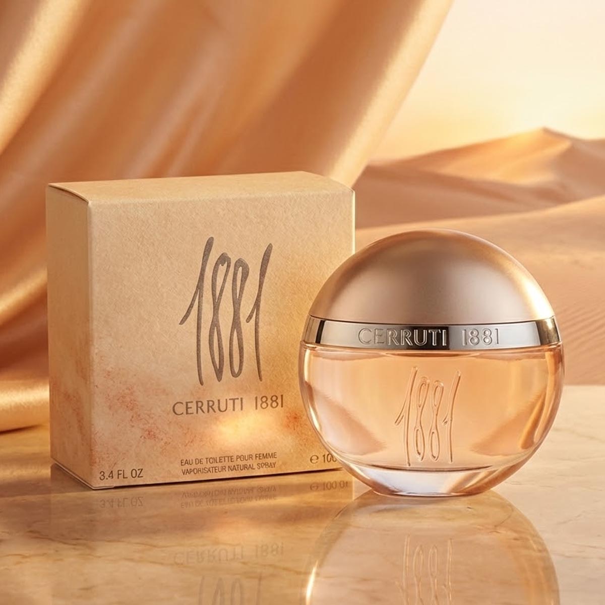 زجاجة دائرية بتصميم متجمد أنيق تحمل الرقم "1881" بنقش بارز، مع غطاء معدني فاخر، وتغليف بيج ناعم يعكس روح العطر الكلاسيكية والأنثوية.