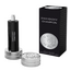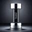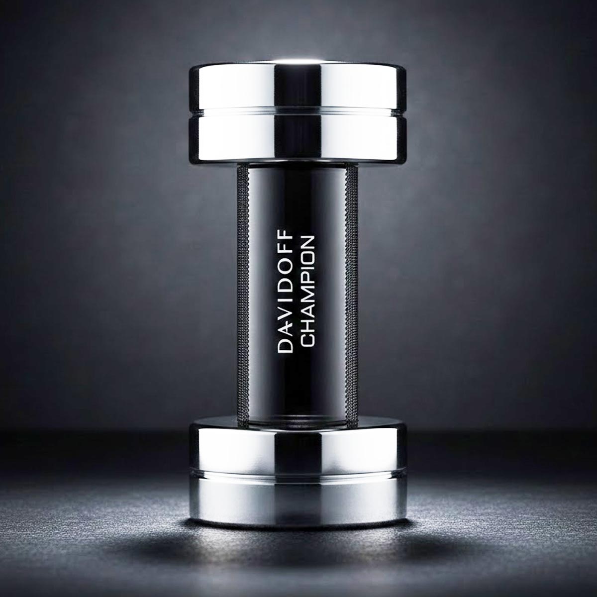 زجاجة مبتكرة على شكل دمبل رياضي، تجمع بين المعدن الفضي والقبضة السوداء، داخل تغليف أسود أنيق يحمل تصميمًا مستوحى من الأوزان الرياضية، يعكس طابع العطر القوي والمميز.