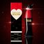 زجاجة مبتكرة بتصميم يشبه شخصية كرتونية، تجمع بين الأحمر والأسود والأبيض، مع تغليف يحمل قلبًا أبيض يعكس روح العطر المرحة والرومانسية.
