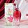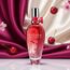 زجاجة بتدرج لوني من الأحمر إلى الشفاف مزينة برسومات كرز، مع شريط أحمر وسحر صغير عند العنق، وتغليف فني يعكس روح العطر المرحة والموسمية.