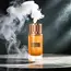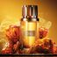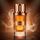 زجاجة شفافة بسائل عنبري وغطاء برونزي فاخر، مع تغليف معدني أنيق يعكس هوية العطر الملكية.