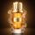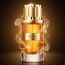 زجاجة أسطوانية أنيقة بسائل عنبري وغطاء ذهبي فاخر، مع تغليف أسود ذهبي يعكس هوية العطر الملكية.