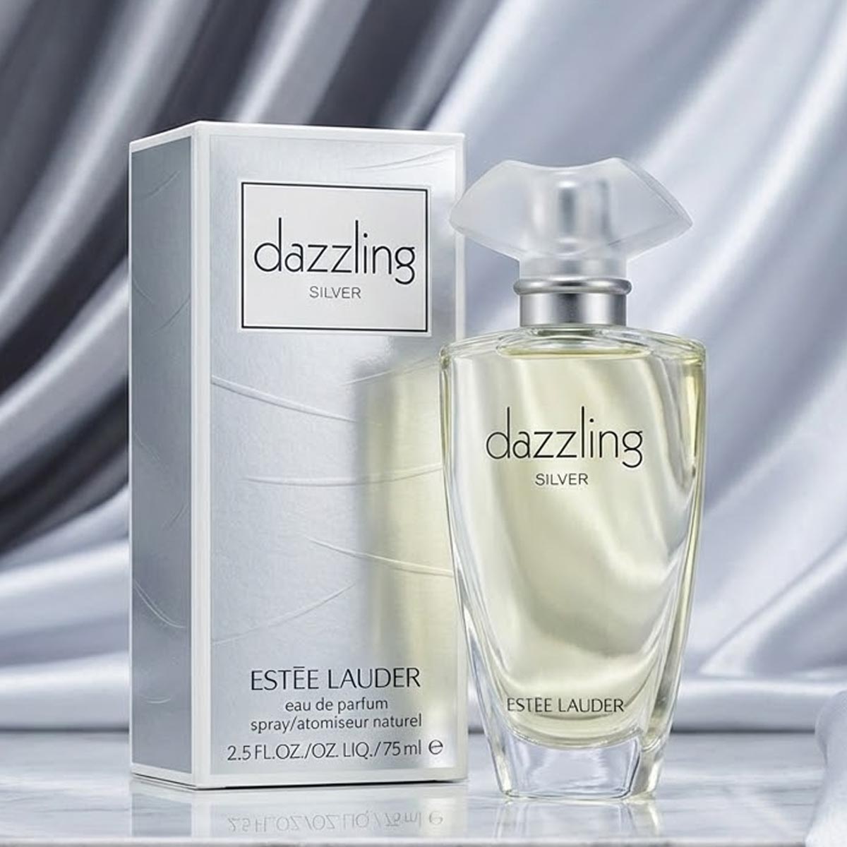 زجاجة شفافة أنيقة بغطاء متدرج يشبه الزهرة، مع تغليف فضي أنيق يحمل شعار Dazzling Silver بأسلوب عصري راقٍ.