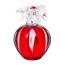 زجاجة حمراء بتصميم يشبه التفاحة مع غطاء كريستالي فاخر، وتغليف أبيض مزين بتفاصيل حمراء يعكس روح العطر الأنثوية والمرحة.