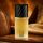 زجاجة أسطوانية أنيقة بتصميم مضلع فريد، تحتوي على سائل بلون أصفر فاتح، مع غطاء أسود فاخر وتغليف أسود بخطوط عمودية تعكس الطابع الكلاسيكي للعطر.