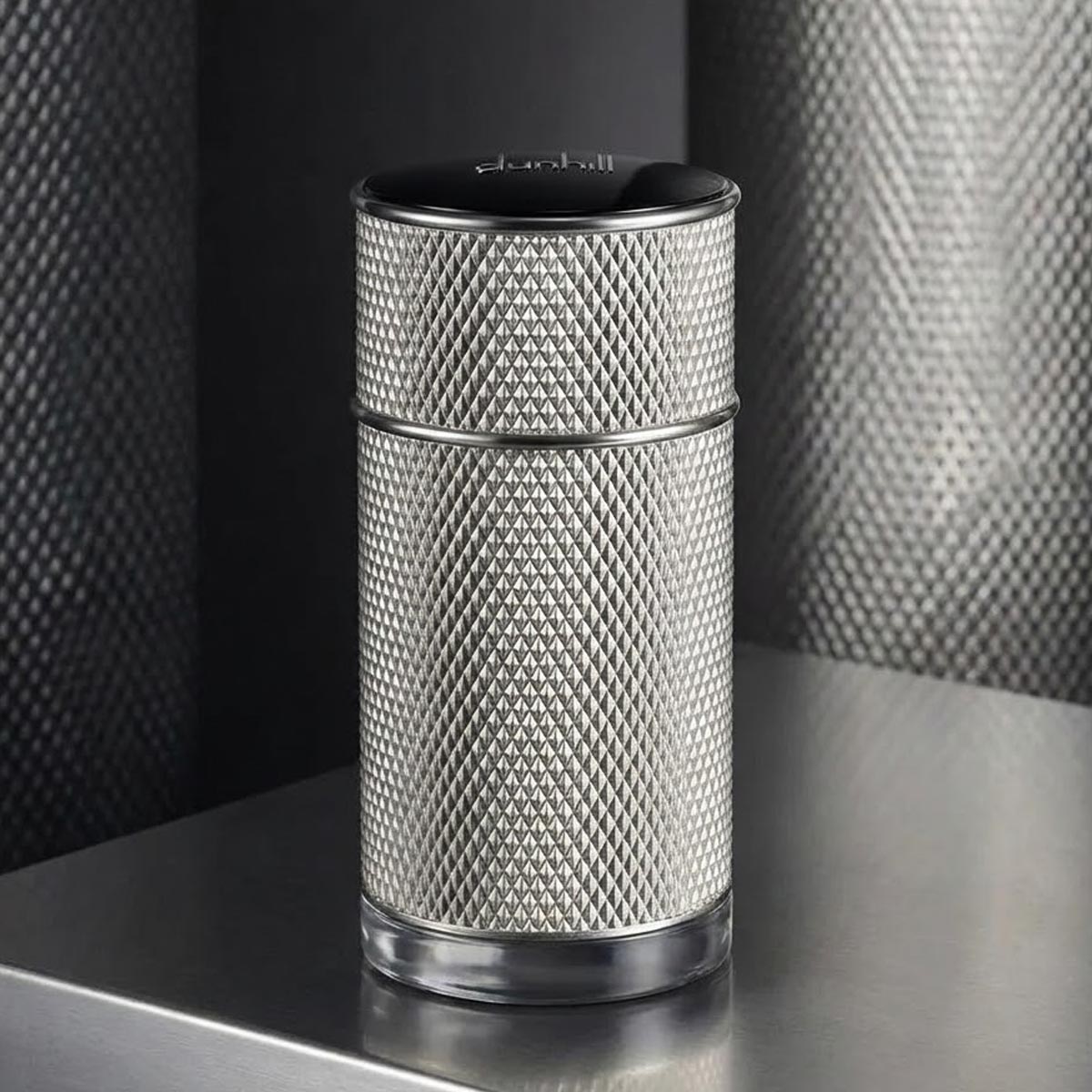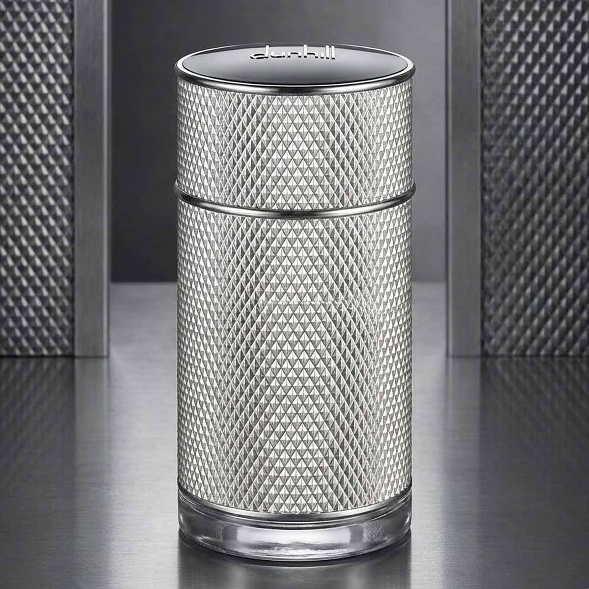 زجاجة أسطوانية معدنية فاخرة بنقشة ماسية أنيقة، تعكس روح العطر الفخمة والراقية، مع تغليف فضي أنيق يحمل شعار ICON المميز.