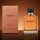 زجاجة مستطيلة أنيقة بسائل كهرماني فاتح، مع غطاء أسود ولمسات معدنية فاخرة، وتغليف بلون برتقالي-بني يعكس دفء العطر وأناقة التصميم.