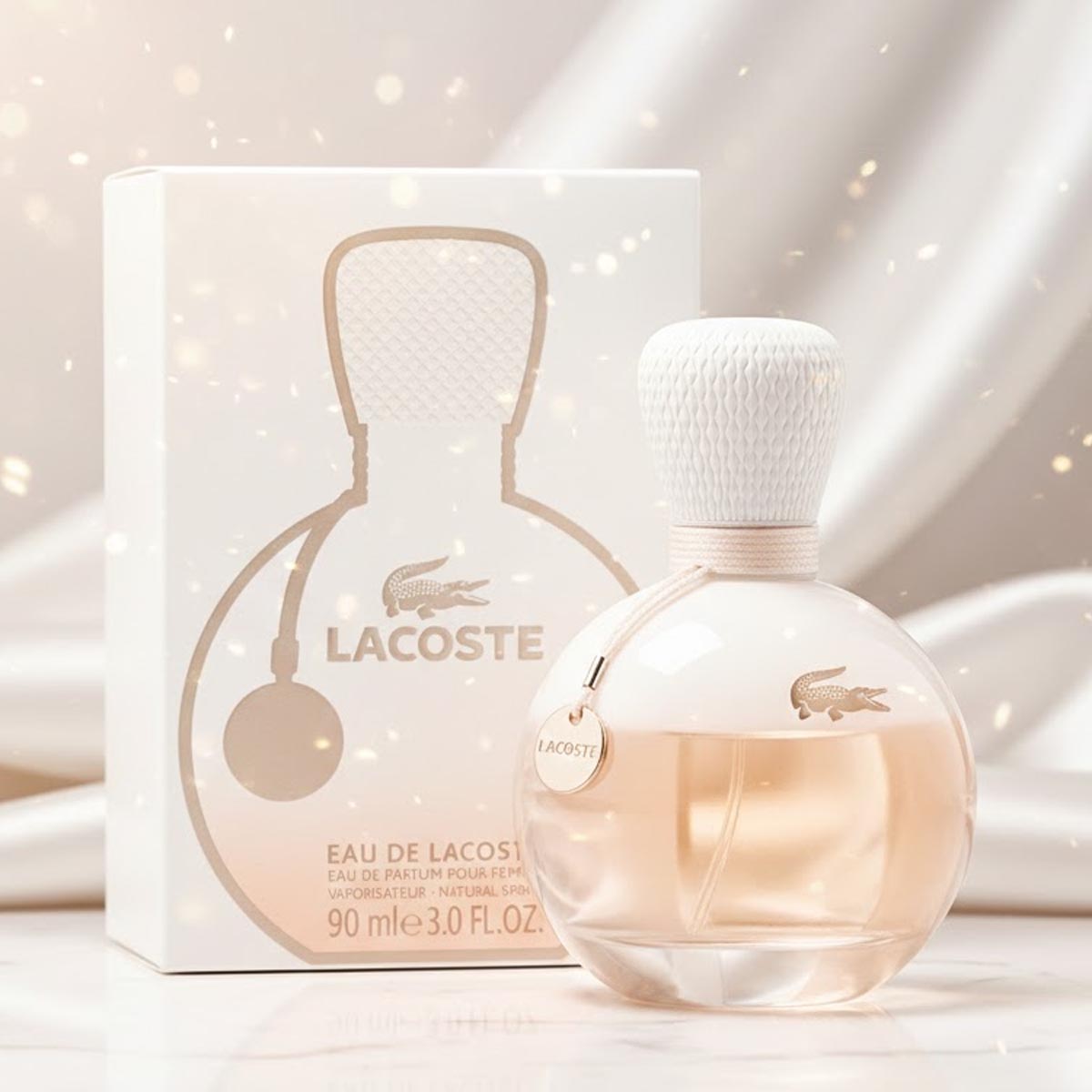 زجاجة دائرية أنيقة بتدرج لوني من الخوخي إلى الشفاف، مزودة بغطاء أبيض مزخرف وسلسلة ذهبية تحمل شعار Lacoste، وتغليف فاخر يعكس روح العطر النقية والراقية.