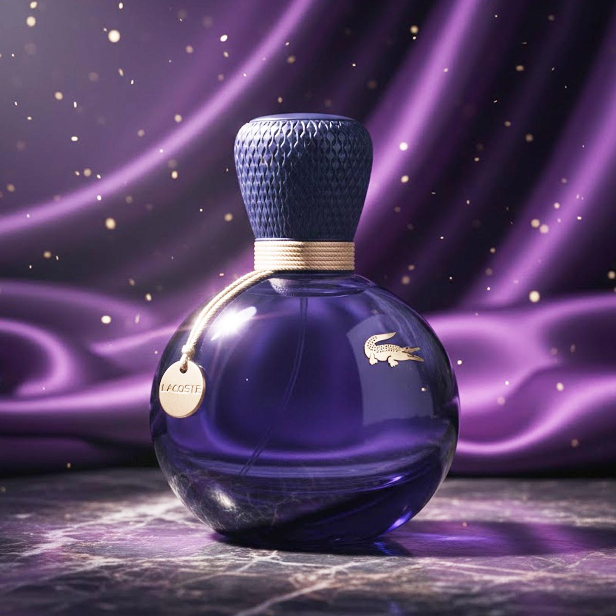زجاجة دائرية أنيقة بلون أزرق داكن، مزودة بغطاء مزخرف وسلسلة ذهبية تحمل شعار Lacoste، وتغليف فاخر يعكس الطابع الغامض والجذاب للعطر.