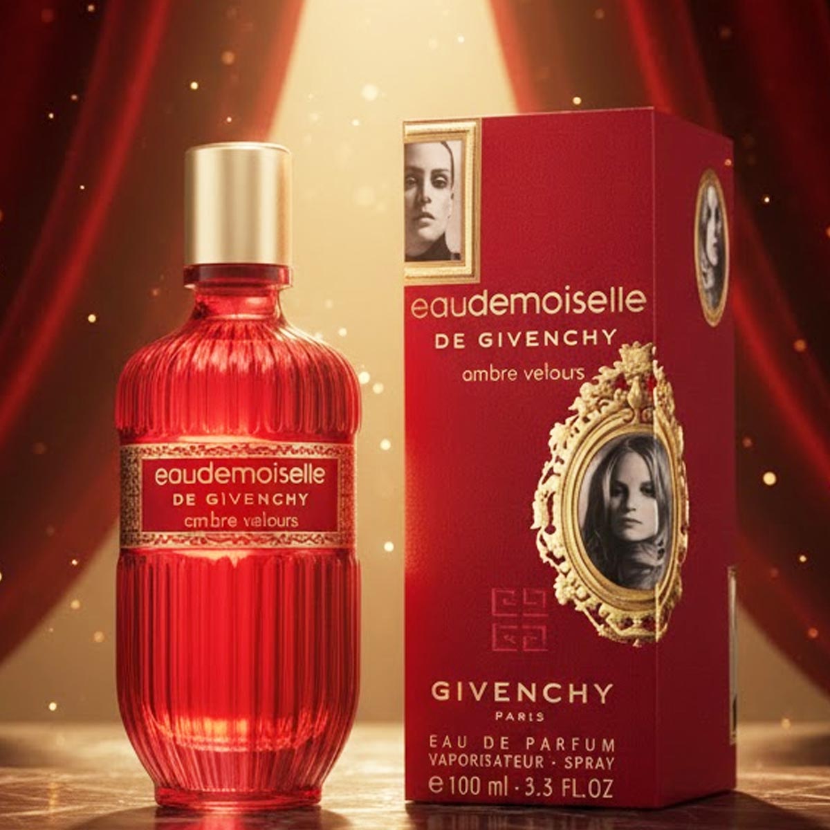 زجاجة مضلعة بلون خمري فاخر مع غطاء ذهبي أنيق، وتغليف فني مزين بصور كلاسيكية يعكس الطابع المخملي والراقي للعطر.