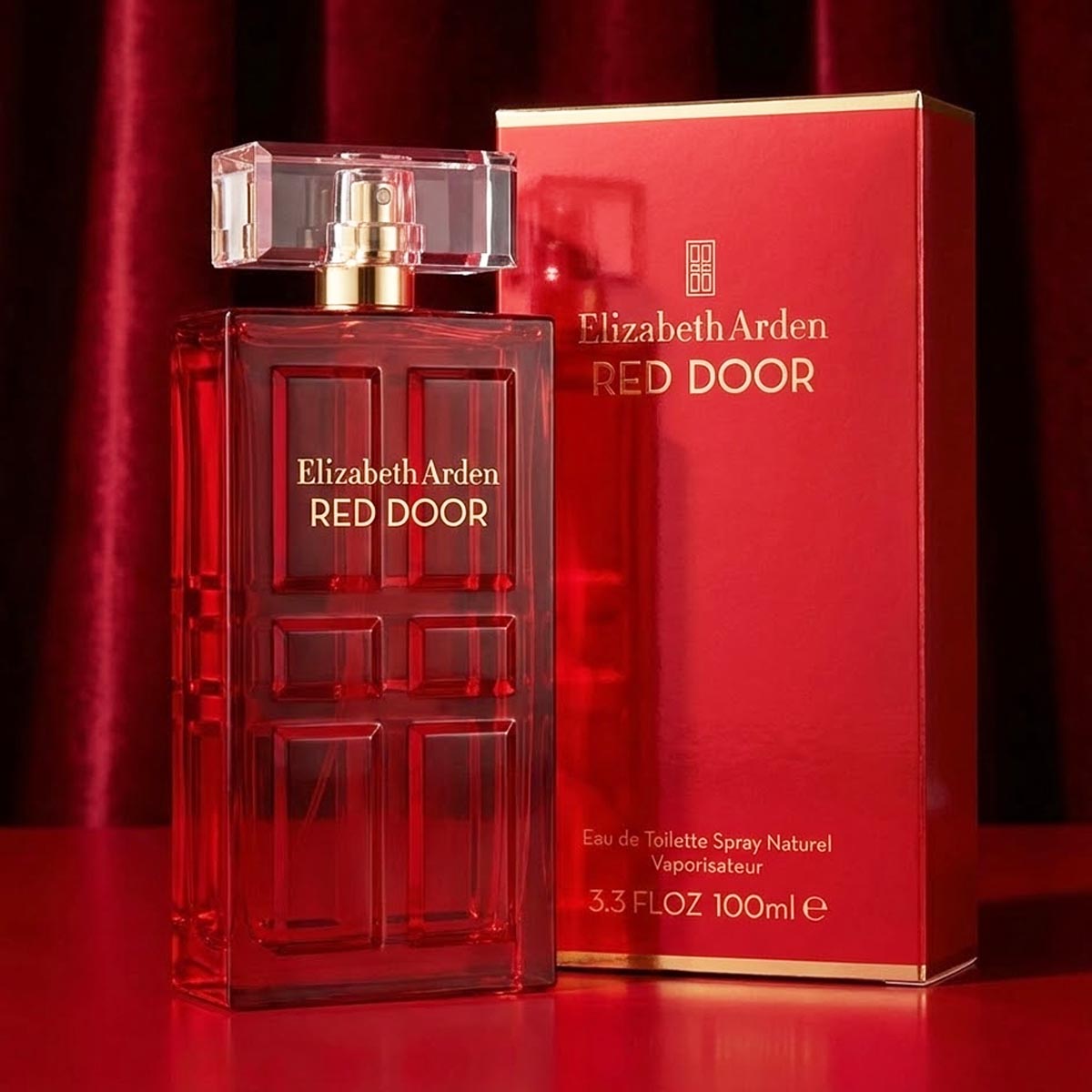 زجاجة حمراء أنيقة بتصميم يشبه الباب الكلاسيكي، مع غطاء شفاف مستطيل، وتغليف فاخر يحمل شعار Red Door بأسلوب جذاب.