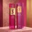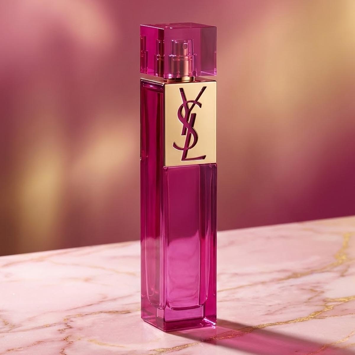 زجاجة طويلة شفافة بلون وردي نابض، مزينة بشعار YSL الذهبي، مع تغليف فاخر بتدرجات الوردي والبنفسجي يعكس روح العطر الجريئة.