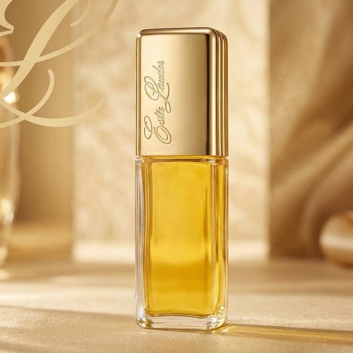 زجاجة مستطيلة أنيقة بسائل ذهبي وغطاء فاخر، مع تغليف بلون أصفر فاتح وحدود زرقاء تحمل شعار Estée Lauder بأسلوب كلاسيكي راقٍ.
