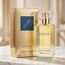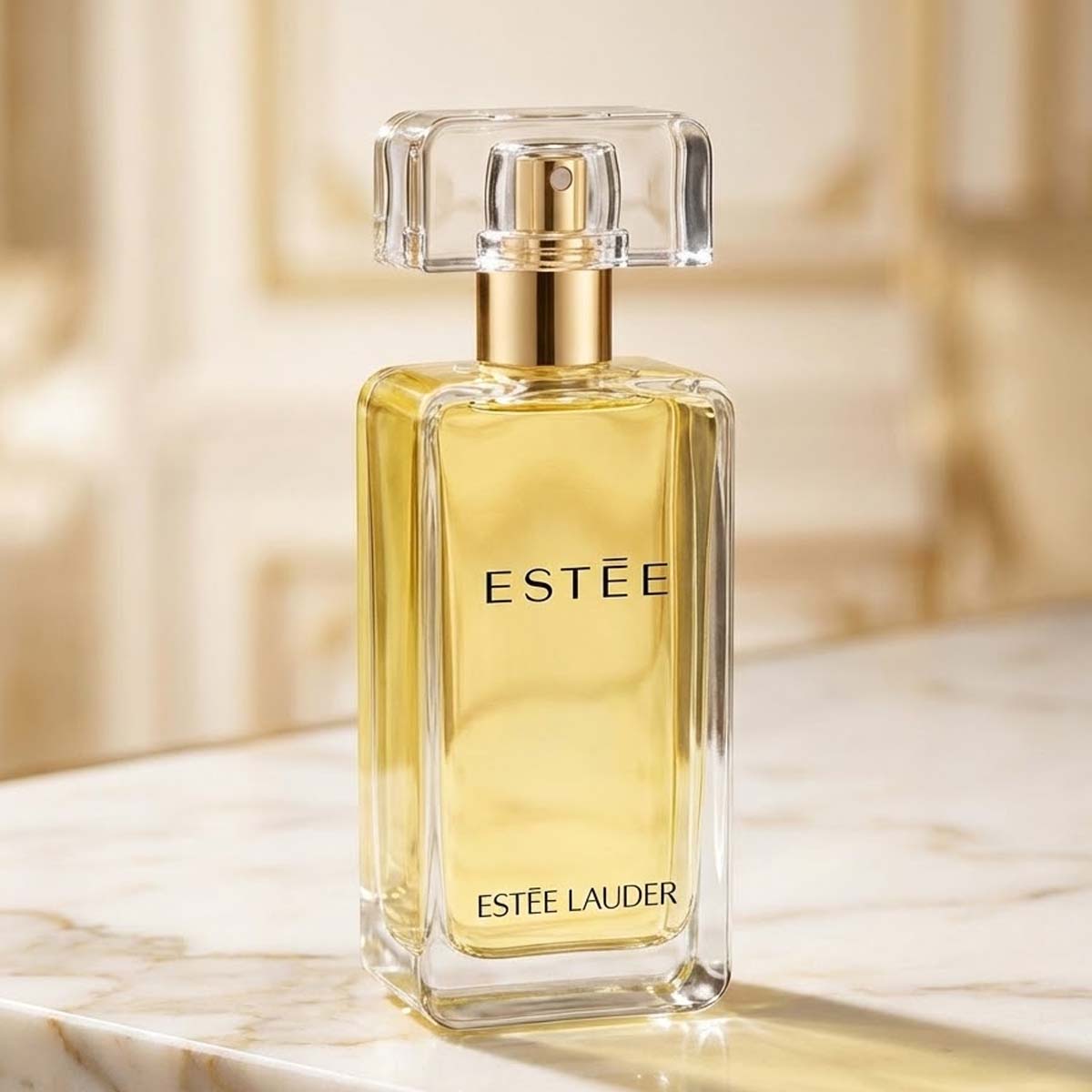 زجاجة شفافة أنيقة بسائل أصفر فاتح وغطاء ذهبي، مع تغليف ذهبي يحمل شعار Estée داخل مربع أزرق أنيق.
