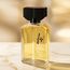 زجاجة شفافة أنيقة بسائل أصفر فاتح وغطاء أسود كلاسيكي، مع تغليف وردي يحمل توقيع Fidji بأسلوب بسيط وراقي.