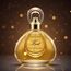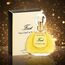 زجاجة أنيقة بسائل ذهبي كهرماني وغطاء منحوت شفاف، وتغليف ذهبي فاخر يحمل توقيع Van Cleef & Arpels بأسلوب كلاسيكي راقٍ.