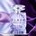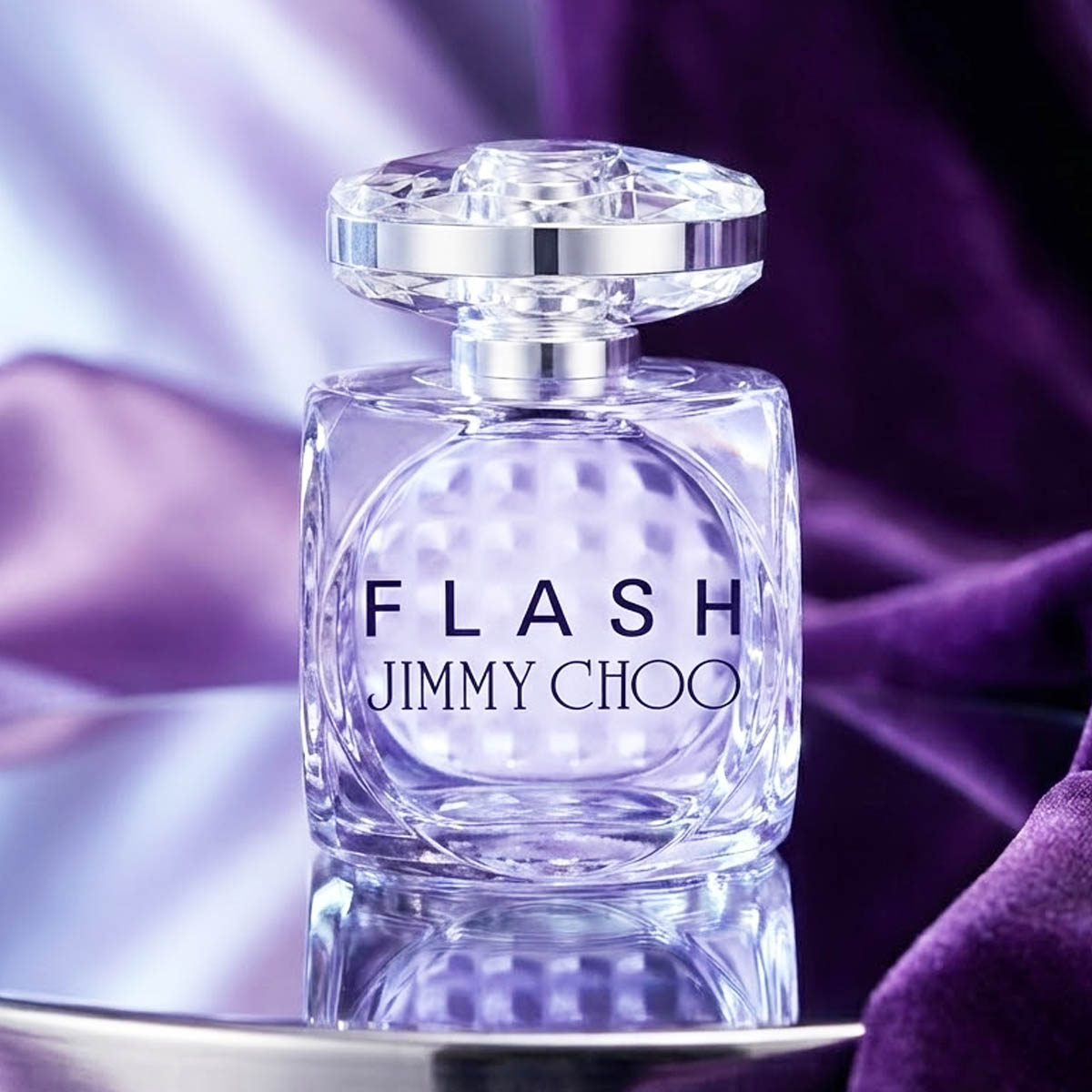 زجاجة بنفسجية شفافة بتصميم متعدد الأوجه، مع غطاء فضي لامع، وتغليف فضي لامع يعكس روح العطر المتألقة.