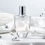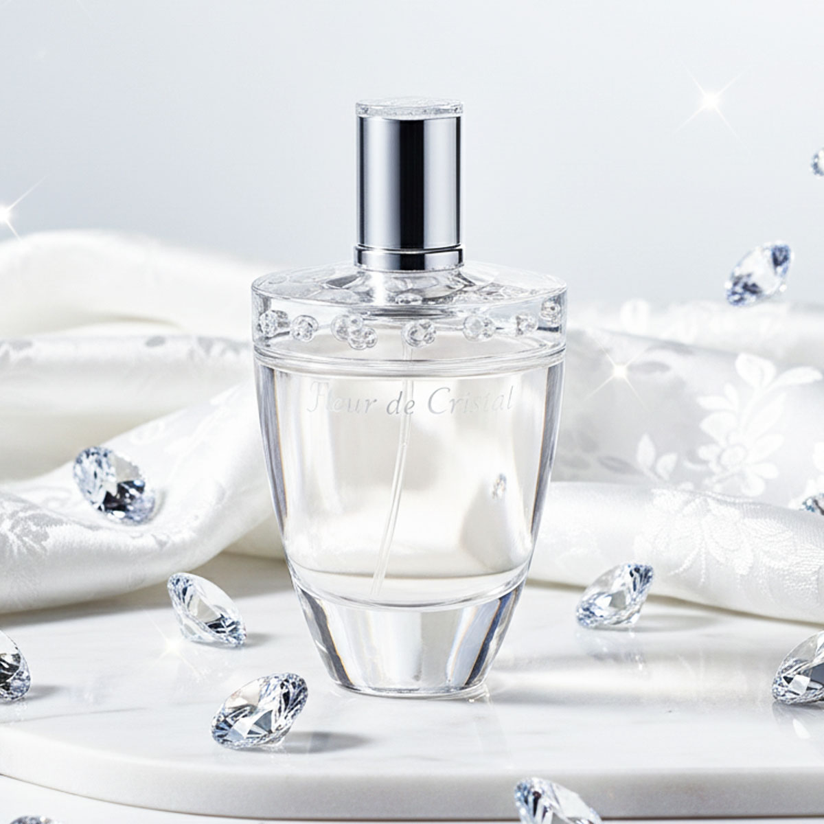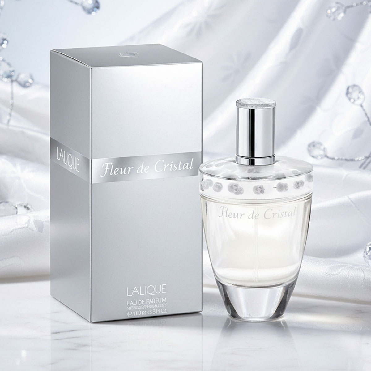 زجاجة شفافة أنيقة مزينة بزخارف زهرية بلورية حول العنق، مع غطاء فضي لامع، داخل تغليف فضي فاخر يعكس طابع العطر النقي والفني.