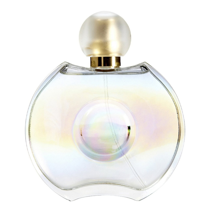 - زجاجة لؤلؤية ساحرة: تتميز الزجاجة بتصميم دائري فريد بزجاج متلألئ (Iridescent) يعكس ألوان الطيف كالوردي والأزرق والذهبي، مما يجعلها تبدو كجوهرة ثمينة أو لؤلؤة مضيئة على طاولتك.