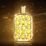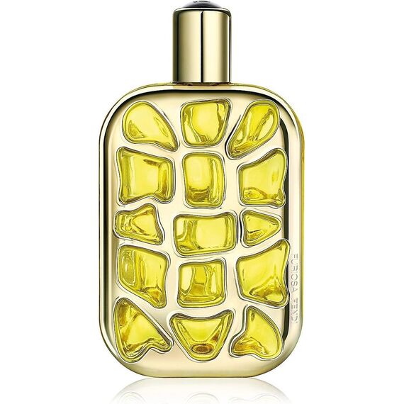 زجاجة فنية بتصميم يشبه النقوش الحيوانية، بلون ذهبي وأصفر، تعكس روح العطر الجريئة والفاخرة، مع تغليف أبيض مزخرف بنقوش بارزة.