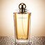 زجاجة شفافة أنيقة تحتوي على سائل ذهبي، بغطاء كروي ذهبي مزخرف بحلقات فضية، وتغليف فاخر بلون ذهبي مزين برمز فني – يعكس الفخامة والرقي.