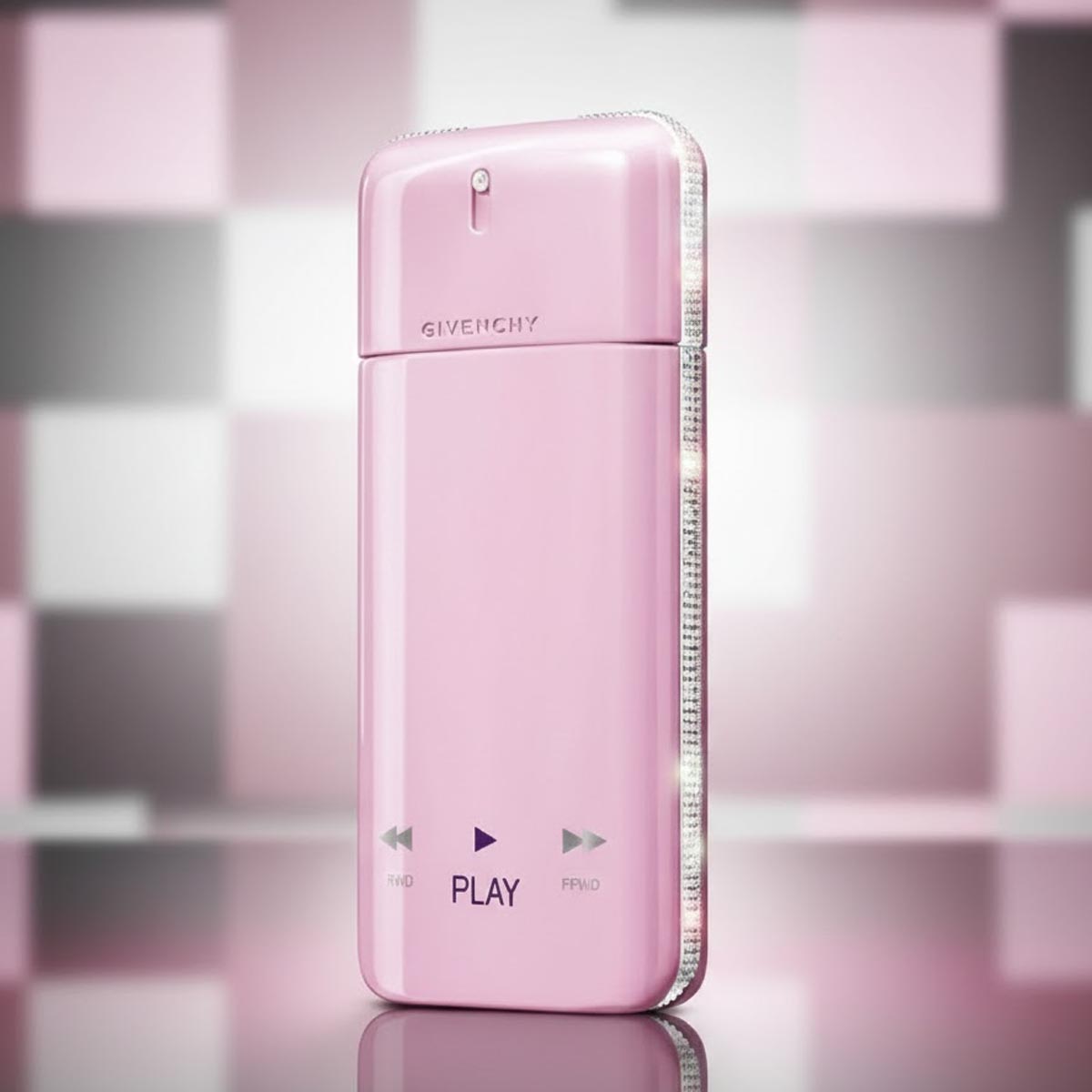 زجاجة وردية أنيقة مستوحاة من مشغل موسيقى، تحمل رموز "PLAY" و"FFWD"، تعكس روح العطر المرحة والعصرية، مع تغليف فضي أنيق.