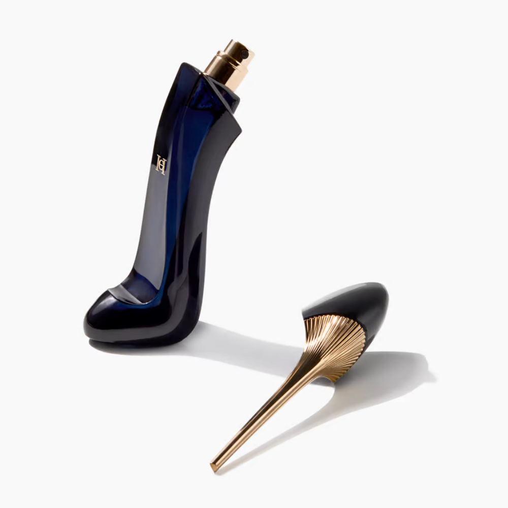 زجاجة فنية بتصميم حذاء بكعب عالي بلون أزرق داكن ولمسة ذهبية، تعكس روح العطر الجريئة والمغرية، مع تغليف أسود فاخر يحمل عبارة "It's so good to be bad".