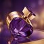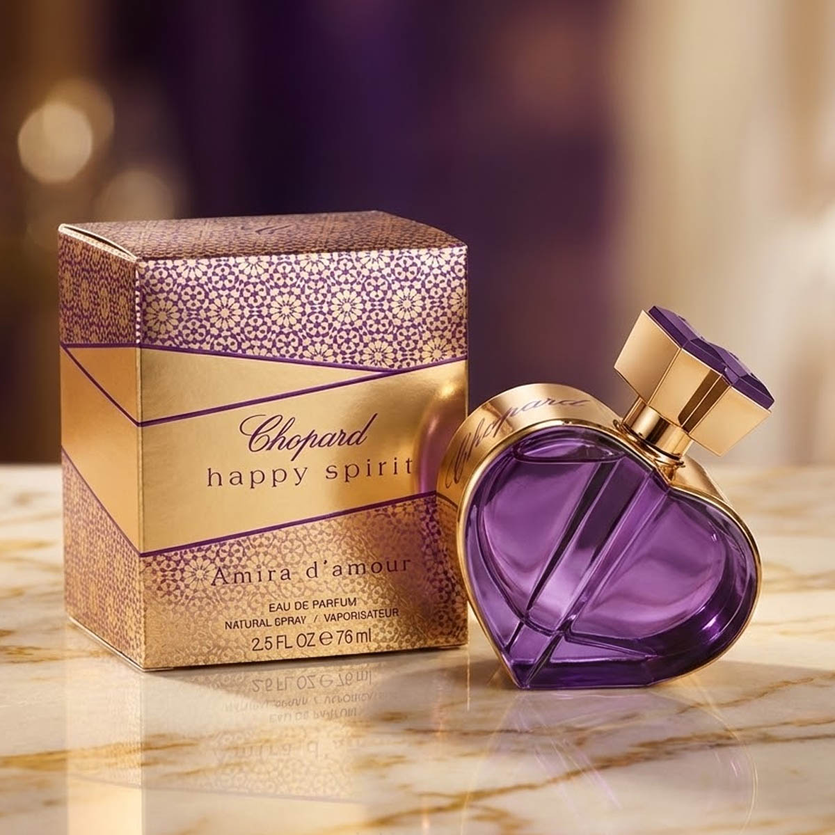زجاجة على شكل قلب بلون بنفسجي ملكي وغطاء ذهبي أنيق، مع تغليف مزخرف يعكس روح العطر الشرقية الفاخرة.
