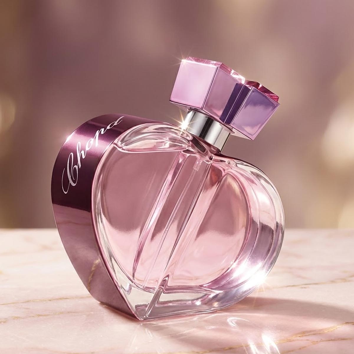 زجاجة على شكل قلب بلون وردي أنيق، مع غطاء معدني وردي، وتغليف وردي يحمل توقيع Chopard بأسلوب أنثوي راقٍ.